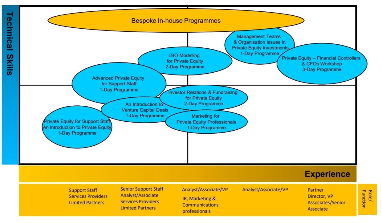 Our private equity training programmes have been developed by our faculty, specifically with practitioners in mind and are aimed at all levels. Whether you require an overview course such as Private Equity for Support Staff, or more advanced skills based courses such as Modelling, or Fundraising & Investor Relations skills, we have a specific programme for you.